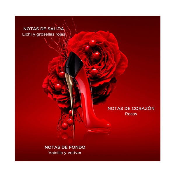Very Good Girl te poartă într-o călătorie olfactivă surprinzătoare, care începe cu o explozie fructată și feminină de note de vârf din coacăze roșii și litchi exotic, pentru a se transforma într-o inimă seducătoare dominată de trandafir.